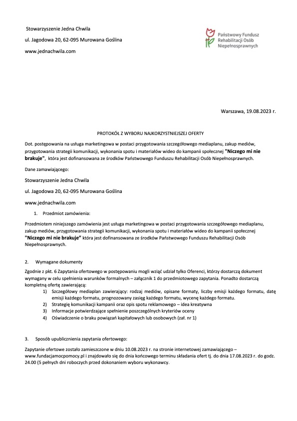 W dniu 19.08.2023 wybrano oferenta do realizacji kampanii społecznej "Niczego mi nie brakuje".