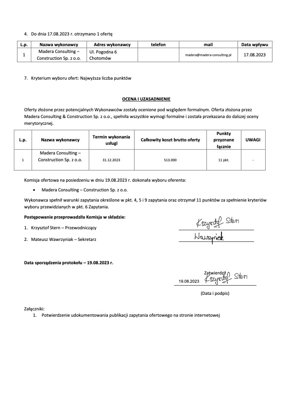 W dniu 17.08.2023 wpłynęła jedna oferta.